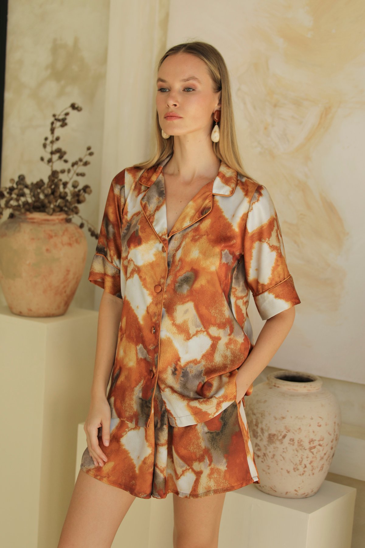BRUME GÖMLEK ÜST – %100 İPEK SATEN TURUNCU-GRİ