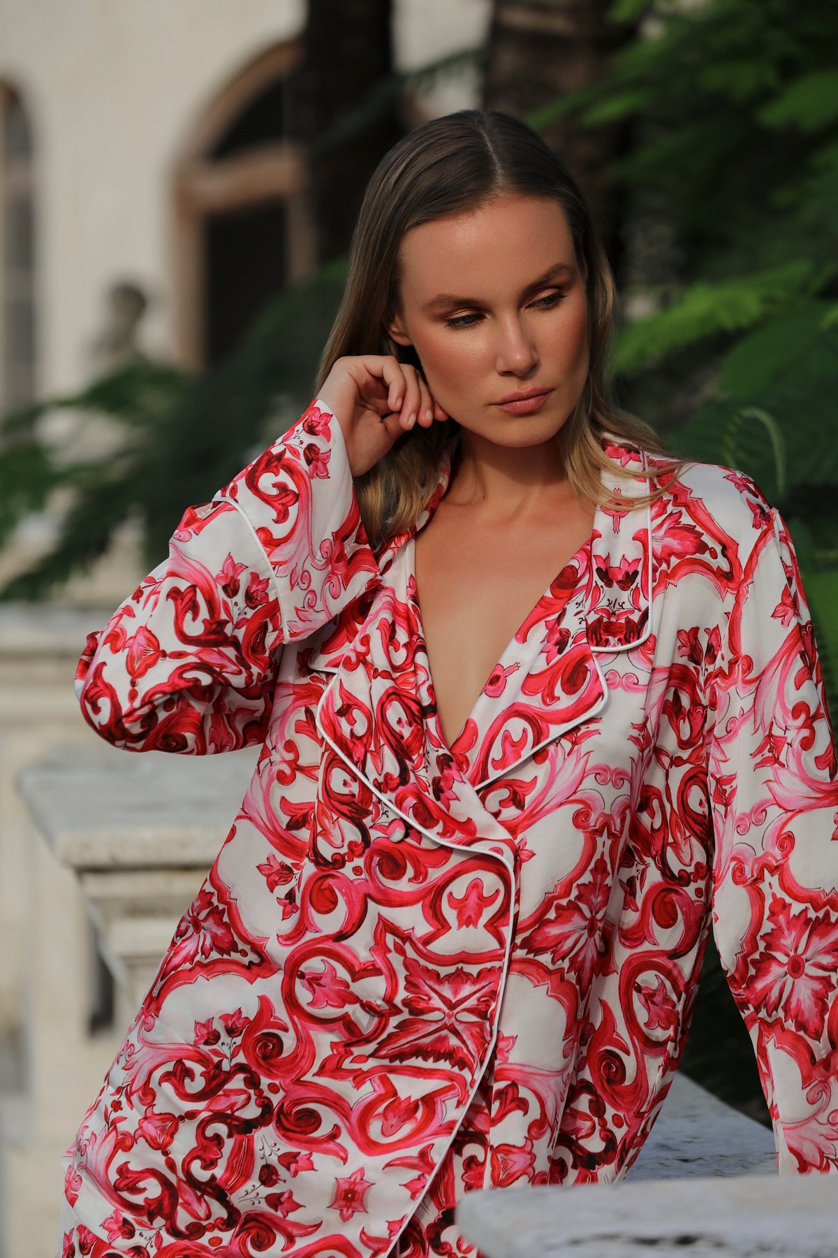 ROUGE ROYAL PANTOLON TAKIM – %100 İPEK SATEN KIRMIZI-BEYAZ